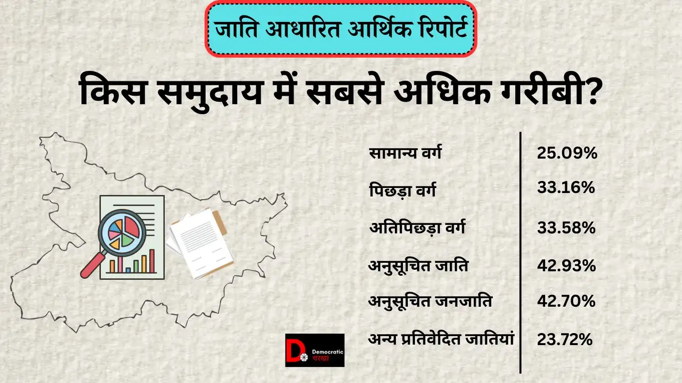 आर्थिक सर्वेक्षण रिपोर्ट जारी हुई है. राज्य में अनुसूचित जाति के 42.93% परिवार गरीब हैं. SC के बाद सबसे अधिक गरीबी अनुसूचित जनजाति (42.70%), अत्यंत पिछड़ा वर्ग (33.58%), पिछड़ा वर्ग (33.16%) और सामान्य वर्ग (25.09%) के परिवार में हैं.