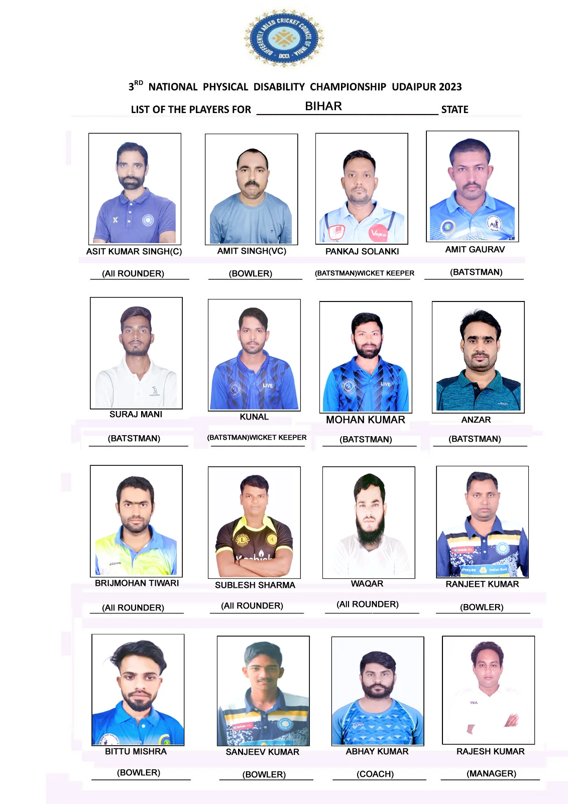 आगामी 28 सितंबर से 8 अक्टूबर तक राजस्थान के उदयपुर में आयोजित तीसरा नेशनल दिव्यांग क्रिकेट प्रतियोगिता के लिए बिहार टीम की घोषणा कर दी गयी है. टीम की कप्तानी अनुभवी दिग्गज आसीत कुमार सिंह को दी गयी है.