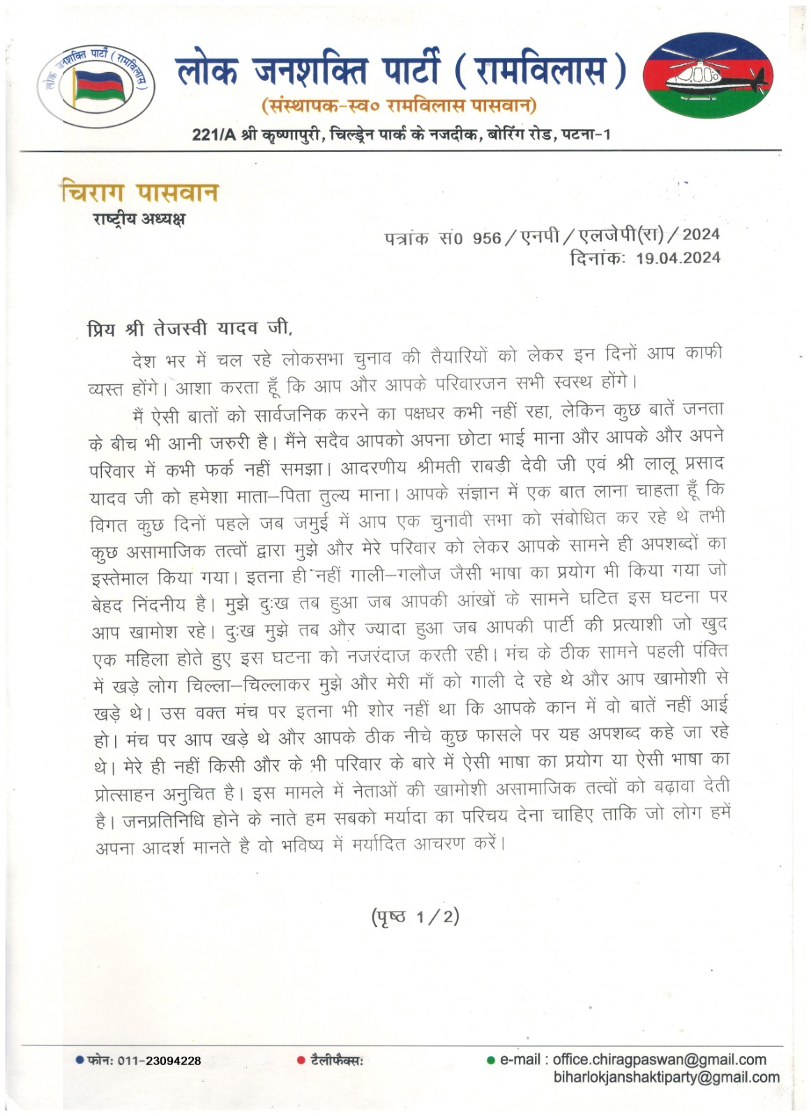 पत्र में चिराग पासवान ने लिखा देश भर में चल रहे लोकसभा चुनाव की तैयारियों को लेकर इन दिनों आप व्यस्त होंगे. आशा करता हूं कि आप और आपके परिजन सभी स्वस्थ होंगे. मैं ऐसी बातों को सार्वजनिक करने का पक्षधर कभी नहीं रहा, लेकिन कुछ बातें जनता के बीच में भी आनी जरूरी है. मैंने सदैव आपको अपना छोटा भाई माना और आपके और अपने परिवार में कभी फर्क नहीं समझा. आदरणीय श्रीमती राबड़ी देवी जी एवं श्री लालू प्रसाद यादव जी को हमेशा माता-पिता तुल्य माना. आपके संज्ञान में एक बात लाना चाहता हूं कि कुछ असामाजिक तत्वों द्वारा मुझे और मेरे परिवार को लेकर आपके सामने ही अपशब्दों का इस्तेमाल किया गया. इतना ही नहीं गाली जैसी भाषा का प्रयोग भी किया गया, जो बेहद निंदनीय है. मुझे दुःख तब हुआ जब आपकी आंखों के सामने घटित इस घटना पर आप खामोश रहे. दुख मुझे तब और ज्यादा हुआ जब आपकी पार्टी की प्रत्याशी जो खुद एक महिला होते हुए इस घटना को नजरंदाज करते रही.