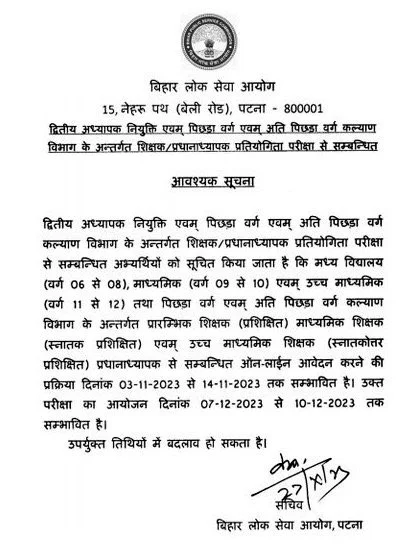 बीपीएससी ने यह भर्ती मिडिल स्कूल के लिए कक्षा 6 से 8, कक्षा 9 से 10 और हायर सेकेंडरी के लिए कक्षा 11 और 12 के लिए जारी की है. परीक्षा के लिए आवेदन की तारीख 3 नवंबर 2023 से 14 नवंबर 2023 तक है. परीक्षा दिसंबर में 7 से 10 के बीच आयोजित की जा सकती है.