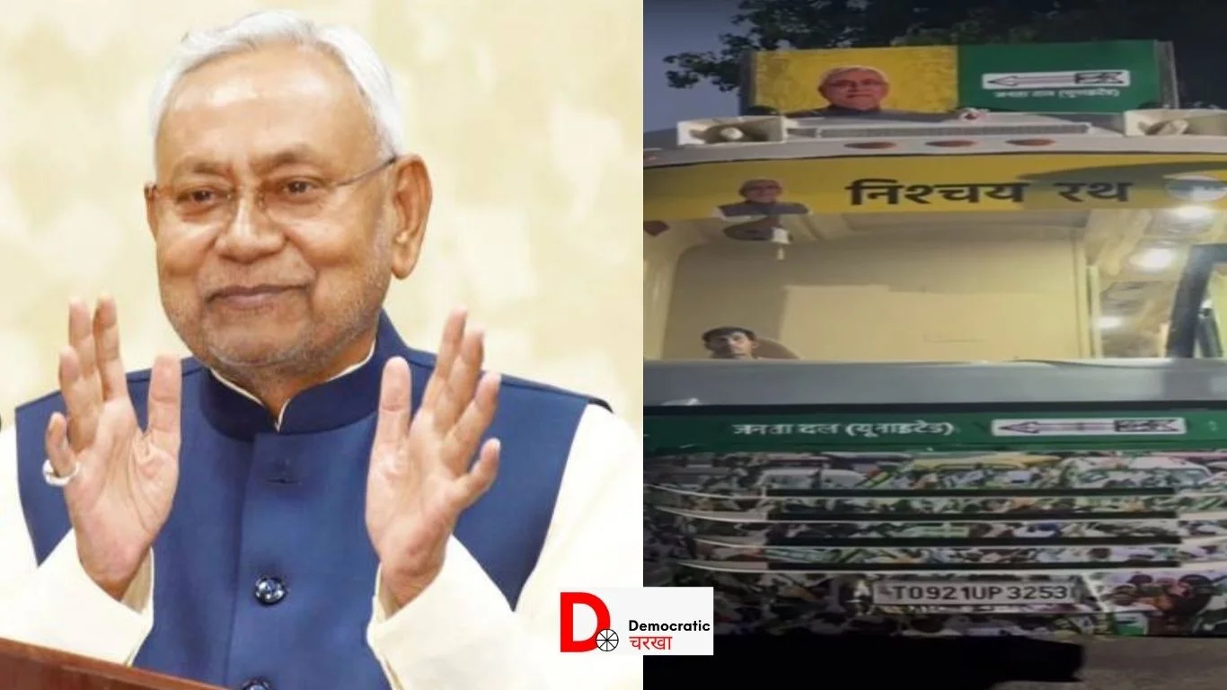 सीएम नीतीश कुमार के ‘निश्चिय रथ’ को खासतौर पर सीएम के कार्यकाल के दौरान उनकी उपलब्धियां को दर्शाने के लिए तैयार किया गया है. बस में बड़े-बड़े अक्षरों में- रोजगार मतलब नीतीश कुमार तो दूसरी ओर पूरा बिहार हमारा परिवार लिखा गया है.