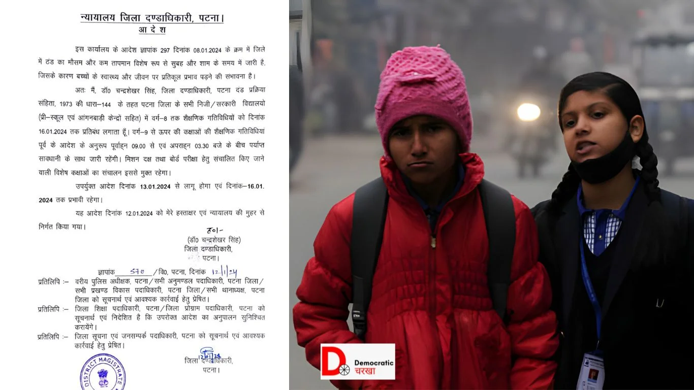 ठंड को देखते हुए पटना के जिला अधिकारी का भी सीना पसीज गया और उन्होंने स्कूल को बंद करने का आदेश जारी कर दिया. मौसम के तेवर को देखते हुए पटना डीएम ने यह फैसला लिया है. जिलाधिकारी चंद्रशेखर ने लेटर जारी करते हुए नर्सरी से लेकर आठवीं तक के क्लास को बंद करने का आदेश दिया है.