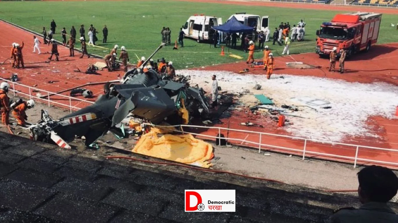 मलेशिया में आज सुबह हवा के बीच दो हेलीकॉप्टर आपस में टकरा गए, जिससे 10 लोगों की मौत हो गई. खबरों के मुताबिक यह दोनों हेलीकॉप्टर नौसेना के थे जो कार्यक्रम की तैयारी में जुटे हुए थे. घटनाग्रस्त हेलीकॉप्टर के अलावा और भी कई हेलीकॉप्टर कार्यक्रम की तैयारी के लिए आसमान में उड़ान भर रहे थे, जिसमें दो हेलीकॉप्टर आसमान में उड़ान भरने की कुछ देर बाद आपस में टकरा गए और नीचे गिर गए.
