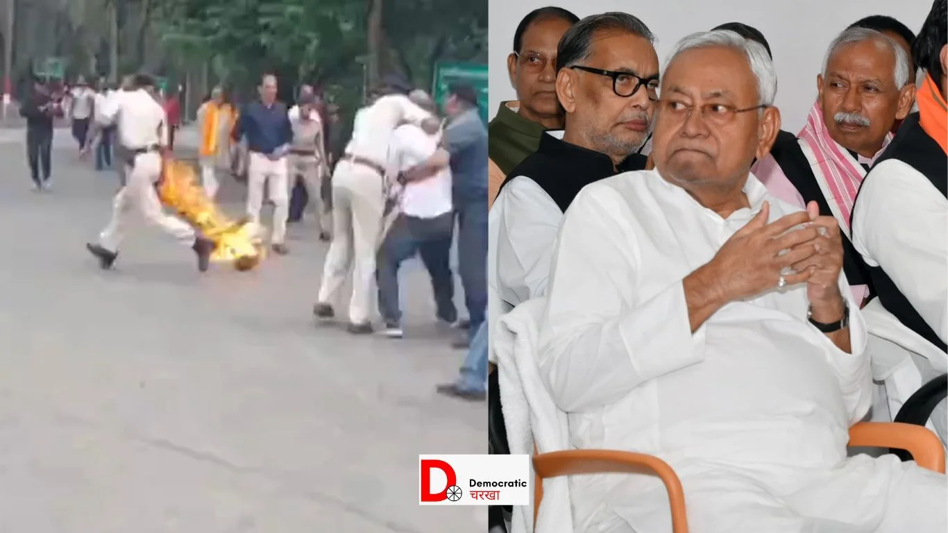 बिहार की राजधानी पटना में आज सियासी हलचल तेज है. सीएम नीतीश कुमार के आवास में आज एनडीए की चुनावी बैठक चल रही है, तो वही सीएम आवास के बाहर अफरा-तफरी का माहौल देखा गया. जानकारी के मुताबिक सीएम आवास के बाहर अचानक एक युवक गाड़ी से पहुंचा और अपने हाथ में आग का जलता हुआ पुतला लेकर विरोध करने लगा. युवक गाड़ी से उतरते ही पुतला लेकर सीएम आवास की ओर बढ़ने लगा, जिससे मौके पर हड़कंप मच गया.