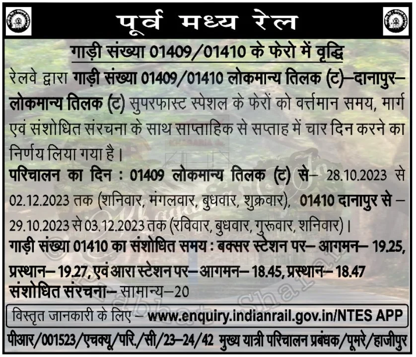 गाड़ी संख्या 01409/01410 के फेरों (UP and Down) में वृद्धि कर अब 21 कर दिया गया है.