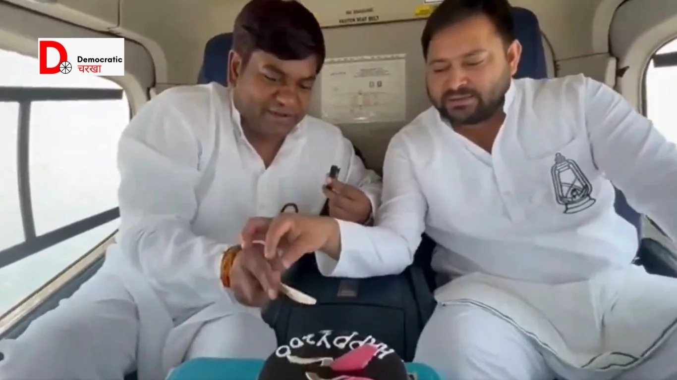 बिहार में इन दिनों चुनावी रैलियां के लिए खूब हवाई यात्राएं चल रही हैं. आसमान में हेलीकॉप्टर ट्रैफिक जैसा माहौल देखने मिलता है. चुनावी रैलियों के दौरान नेता कई बार हेलीकॉप्टर में ही खाना खाते, आराम करते या कुछ सेलिब्रेट करते हुए नजर आ जाते हैं. कुछ महीने पहले ही राजद नेता तेजस्वी यादव और वीआईपी प्रमुख मुकेश सहनी एक साथ चुनाव प्रचार के दौरान हेलीकॉप्टर में मछली खाते हुए नजर आए थे. तेजस्वी यादव के मछली खाने का यह वीडियो राजनीतिक मुद्दा बन गया था. मछली खाने वाले वीडियो सिर्फ बिहार में ही मुद्दा नहीं बना बल्कि पीएम मोदी ने भी इसको लेकर सवाल उठाए थे. अब एक बार फिर तेजस्वी यादव और मुकेश सहनी का हेलीकॉप्टर वीडियो वायरल हो रहा है. इस बार वीडियो में यह दोनों नेता एक साथ मिलकर केक काटते हुए नजर आ रहे हैं.