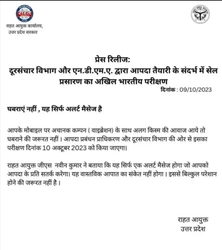 उत्तर प्रदेश सरकार के राहत आयुक्त कार्यालय की ओर से कल एक प्रेस विज्ञप्ति भी जारी की गई, जिसमें लिखा है कि अगर किसी को अचानक मोबाइल पर कंपन के साथ अलग आवाज सुनाई देती है, तो घबराने की जरूरत नहीं है. आपदा प्रबंधन प्राधिकरण और दूरसंचार विभाग द्वारा 10 अक्टूबर 2023 को इसका परीक्षण किया जा रहा है.