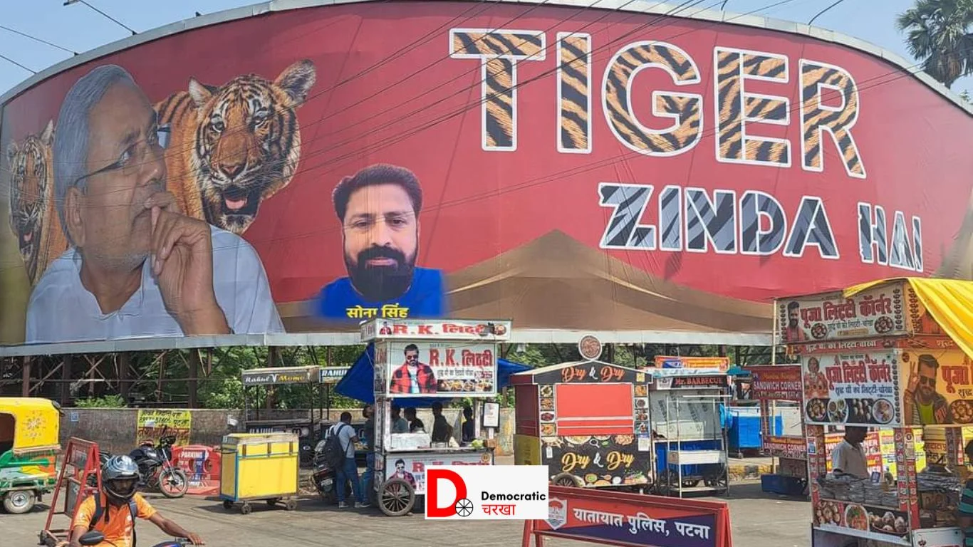 पटना की सड़क पर लगे पोस्टर की चर्चा अब सोशल मीडिया पर तेज हो गई है. पटना के कोतवाली थाने के सामने चौराहे पर सीएम नीतीश कुमार के दोनों तरफ शेरों की तस्वीर लगाई गई है और साथ में ही पोस्टर पर टाइगर जिंदा है लिखा गया है. पोस्टर से सियासी गलियारे में इसकी चर्चा हो रही है. नीतीश कुमार के इस पोस्टर को सोना सिंह नाम के जदयू समर्थक ने लगाया है. जदयू नेता सोना एक जदयू एमएलसी के भाई बताए जा रहे हैं.